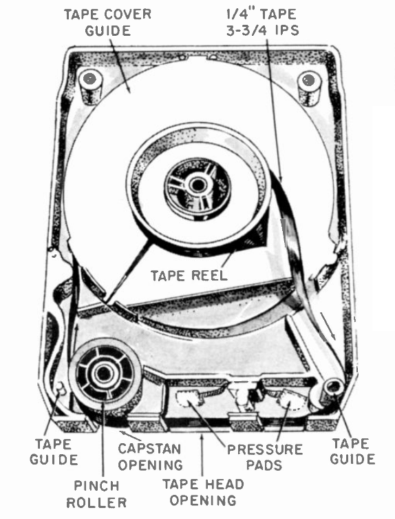 At launch the format was called the Lear Jet Stereo-8 cartridge. Like the Philips Compact Cassette, tape guides and head pressure pads are built into the design of the cartridge. Unlike the Compact Cassette, the eight-track cartridge has an internal pinch roller - originally of nylon/rubber.
