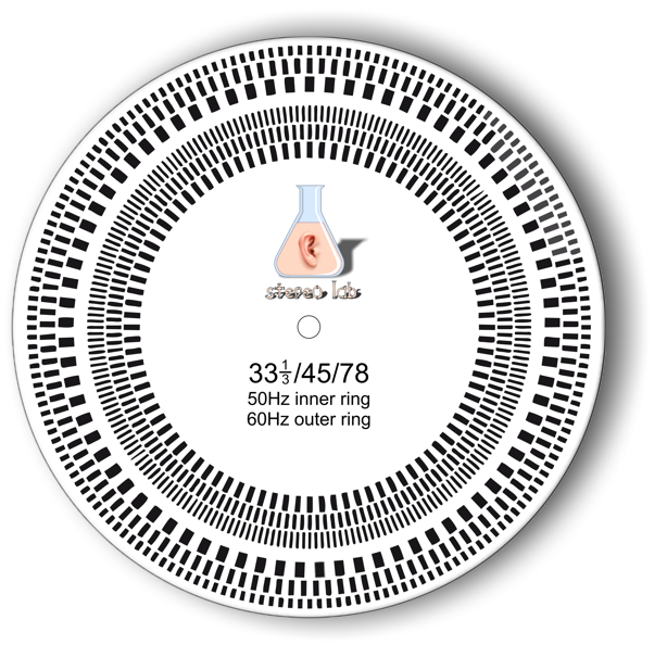 A stroboscope disc is a paper, cardboard or plastic disc with a spindle hole in the centre which may be placed on the turntable like a record to measure the turntable's rotational speed. When illuminated with alternating current lighting, the pattern of bars on the stroboscope disc appears stationary when the turntable speed matches the standard speed³.