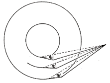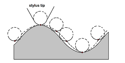 The figure above shows the cross section of a vertically modulated groove (the grey is the disc in cross-section). Whilst the recording is made with a sharp edged chisel, playback is accomplished by means of the spherically rounded cone of the playback stylus. The figure clearly illustrates that the motion of the playback stylus fails to follow the groove's shape. The problem being that the point of contact between the spherical playback stylus and the groove wall wanders as it traces the groove, causing the stylus to trace a path indicated by the dashed line.