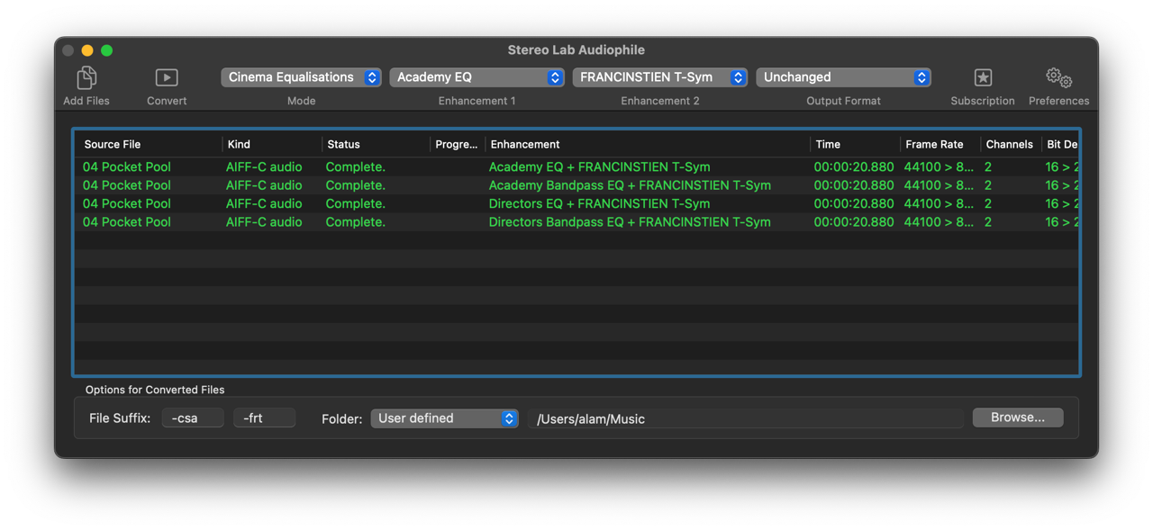 Film audio work has its own mode. The filters and decoders in this mode are the result of considerable research and "archaeology". They are unique to Stereo Lab.