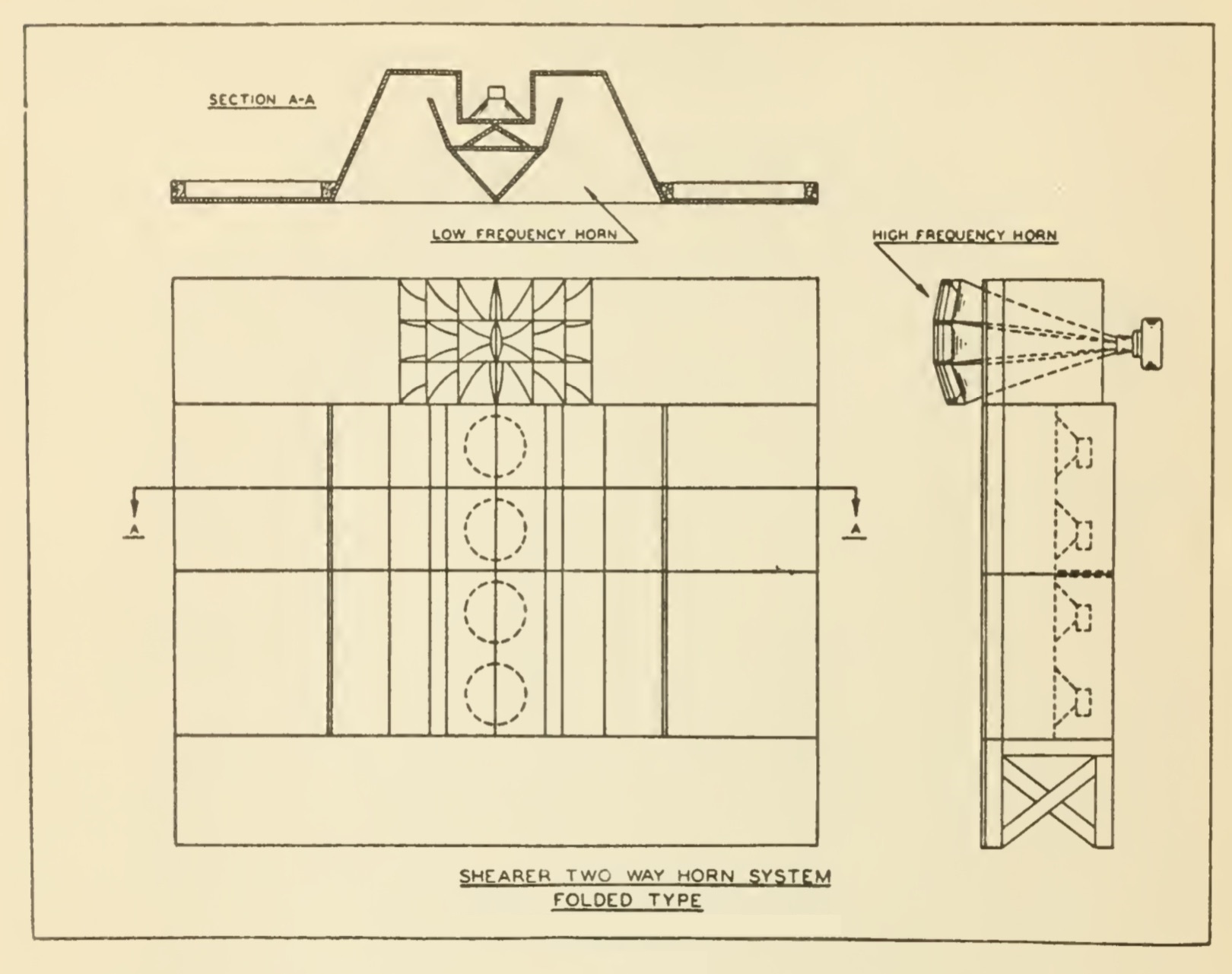 This “Shearer” horn system was a joint development between Douglas Shearer, head of the Metro-Goldwyn-Mayer Sound Department, and the commercial organisations; Electrical Research Products, Inc.; RCA Manufacturing Co.; Lansing Manufacturing Co.; and Loew's, Inc.