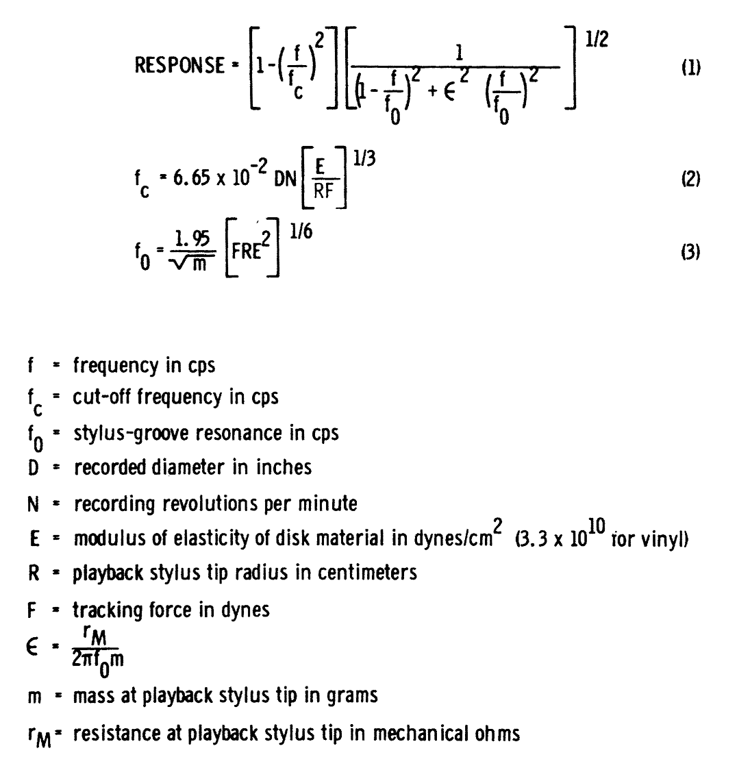 3. Essentially, the effective-mass of the stylus, cantilever and generator assembly resonates (or bounces) on the record-material compliance. The damping of this dynamic system is encapsuled by the epsilon (ϵ) term which holds the balance between the first part of the denominator and which → 0 as f → f0 (and thus sends the overall expression to infinity at f0) and the second part which → 1 as f → f0 and thus causes the response to fall at high-frequencies.